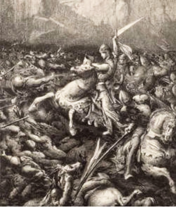 En la batalla entraba audazmente en las filas de sus enemigos abriendo tras él una estela, una especie de surco de autopista tras él, que permitía a sus hombres seguirle. Podemos imaginar la belleza de Carlomagno en la batalla.