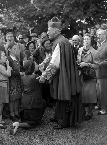 Una mujer disfruta mostrando respeto al Reverendo Cushing en Boston, 1949