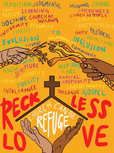 Cada palabra o frase tiene una contraparte en el lado opuesto, indicada por el mismo color. Así, tenemos “tradición” y “cambio”, “qué” y “por qué”, “exclusión” e “inclusión”, “Escritura” y “hospitalidad radical”, “identidad católica” e “identidad LGBT”, “intolerancia” y “diálogo”, etc.