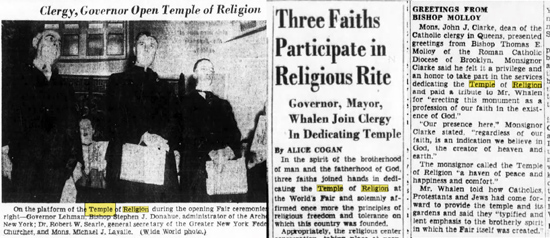 Para la Feria Mundial de Nueva York de 1939, la Iglesia católica estadounidense colaboró con judíos y protestantes para construir un "Templo de la religión" dedicado a la libertad religiosa, con una inscripción sobre la entrada: "Para todos los que adoran a Dios y valoran la libertad religiosa".