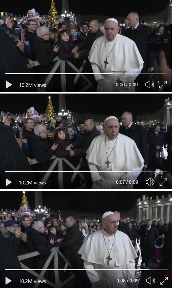 Después de la misa del 31 de diciembre de 2019, el papa Francisco fue a visitar el pesebre en la Plaza de San Pedro. Durante su caminata, saludaba a algunos de los fieles que estaban en fila para verlo.Una mujer china agarró su mano para pedirle su intercesión por el pueblo chino que está perdiendo su fe en su país debido a la creciente persecución del gobierno comunista ... En realidad, según Monte San Marti, las palabras de la mujer fueron: " ¡Espera! ¡Espera! ¡Mira el pueblo chino! ¡Están perdiendo la fe! "Estaba hablando en inglés, lo que obviamente no sabía bien, porque dijo "sostén" en lugar de "espera" y "pueblo" en lugar de "personas".