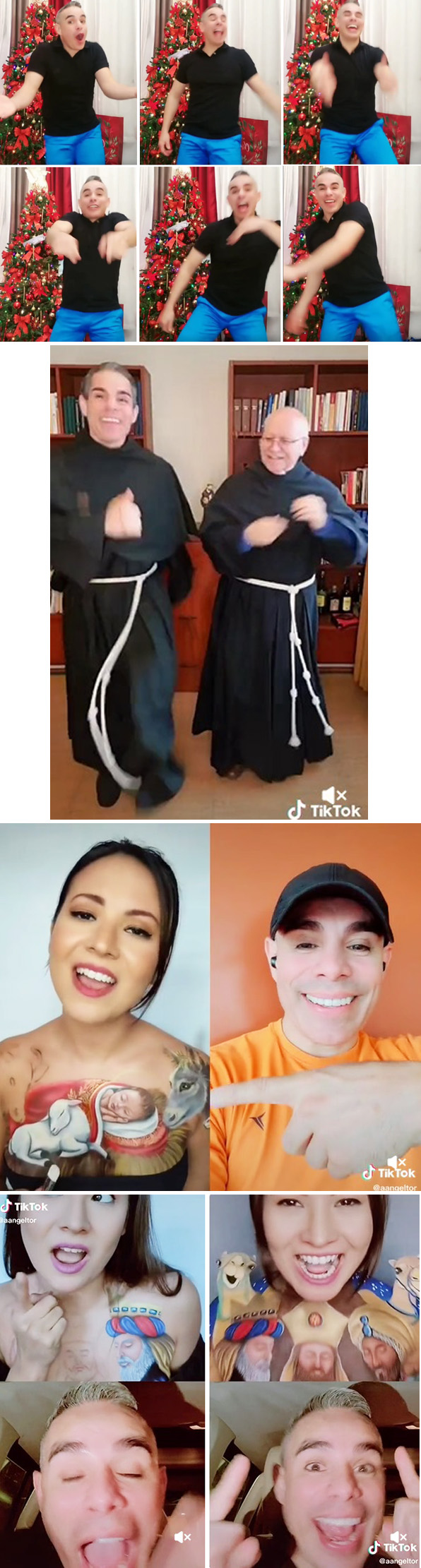 De hecho, Fray Ángel realiza un dúo de TikTok, abajo, tres últimas filas, con una maquilladora impúdica pintándose el pecho con belenes y Reyes y luciendo un escote muy pronunciado. En otro clip lo ves bailando con una joven en una fiesta peruana al aire libre.