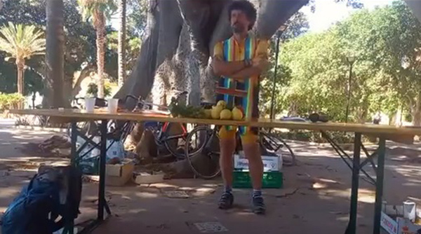 El padre Fabio Corazzina, arriba, publicó en su página de Facebook un video de una Misa que dio el 10 de septiembre de 2022. La Misa fue dicha para un grupo de ciclistas en Lampedusa, una isla en el Mediterráneo cerca de la costa de África que pertenece a Sicilia.El sacerdote dijo la misa vestido con ropa de ciclista, pantalones cortos muy ajustados y una camisa de manga corta, y su única vestimenta era una estola de color arcoíris. El "altar" era una mesa plegable desnuda; el cáliz y la patena eran un vaso desechable de plástico para picnic y un plato de plástico, que las flechas rojas señalan en la imagen de la cuarta fila a continuación. Unos limones colocados sobre la mesa ayudaron a sostener un crucifijo que se tambaleaba; durante la Misa había que poner una bicicleta delante de la mesa para que la cruz no cayera al suelo.