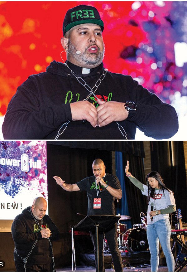 Su estilo de predicación es "visual", como se muestra en las dos últimas filas. Mientras abordaba el tema de la liberación del pecador de las cadenas del pecado, se envolvió en cadenas y se arrodilló para recibir la imposición de manos de dos de sus jóvenes compañeros carismáticos.