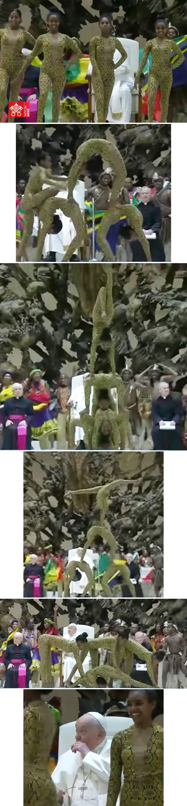 El 8 de enero de 2025, el Papa Bergoglio recibió y disfrutó de una actuación del Circo Africano con sus 60 acróbatas.Entre los artistas destacados había un grupo de cuatro jóvenes contorsionistas atrevidamente vestidas con leotardos ajustados. Estas mujeres presentaron sus exhibiciones directamente frente al Papa. Algunas de ellas incluían provocativas posturas de piernas abiertas que deberían ser condenadas por cualquier persona decente.