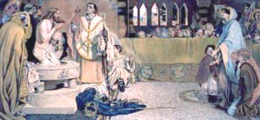 Una vez, Edwin, un pagano, conoció a un extraño que predijo la restauración de su reino si prometía hacer todo lo que se le enseñara con respecto a su propia salvación. Edwin se lo prometió y el extraño, poniéndole la mano sobre la cabeza, le pidió que recordara esa señal. Poco después de ese incidente, debido a diversas circunstancias políticas y militares, Edwin recuperó el Reino de Deira, y luego se convirtió en Rey de toda Northumbria, una de las siete partes en las que Inglaterra estaba dividida en ese momento.