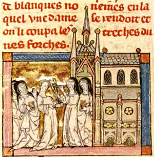 Mujeres nobles medievales siendo recibidas en un convento - Libre de Lancelot de Lac