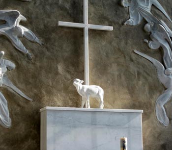 Su mano izquierda estaba vuelta hacia el altar que estaba detrás de él; el altar era sencillo, como cualquier altar ordinario, sin adornos. Sobre el altar estaba un Cordero, del tamaño de un cordero de ocho semanas; el rostro del Cordero miraba hacia el oeste y miraba en dirección a la Santísima Virgen y San José.